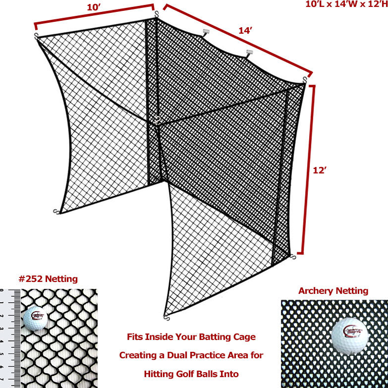 The Cimarron Golf Net Insert is the perfect way to turn your batting cage into a multi-use enclosed practice area for athletes looking to improve their golf drive or ability to make contact with the ball. This system easily is attached to your existing Cimarron Batting Cage through the use of hooks and toggles to catch golf balls as they are hit. Much like the other range of Cimarron Batting Cage equipment, the Cimarron Golf Net Insert is constructed of durable materials for extended use both indoors and outdoors.