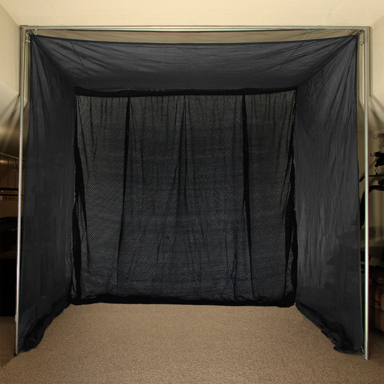 The Cimarron 5x10x10 Clubhouse Golf Net and baffle is 5’ deep and enclosed on the sides and the top with High Density Archery Netting. Not only is Archery netting much stronger than regular golf netting it’s also considerably denser than golf netting making it able to hold up over the course of time much longer. The Cimarron 10x10 Baffle is constructed of heavy duty archery netting and is hung separately inside your net.