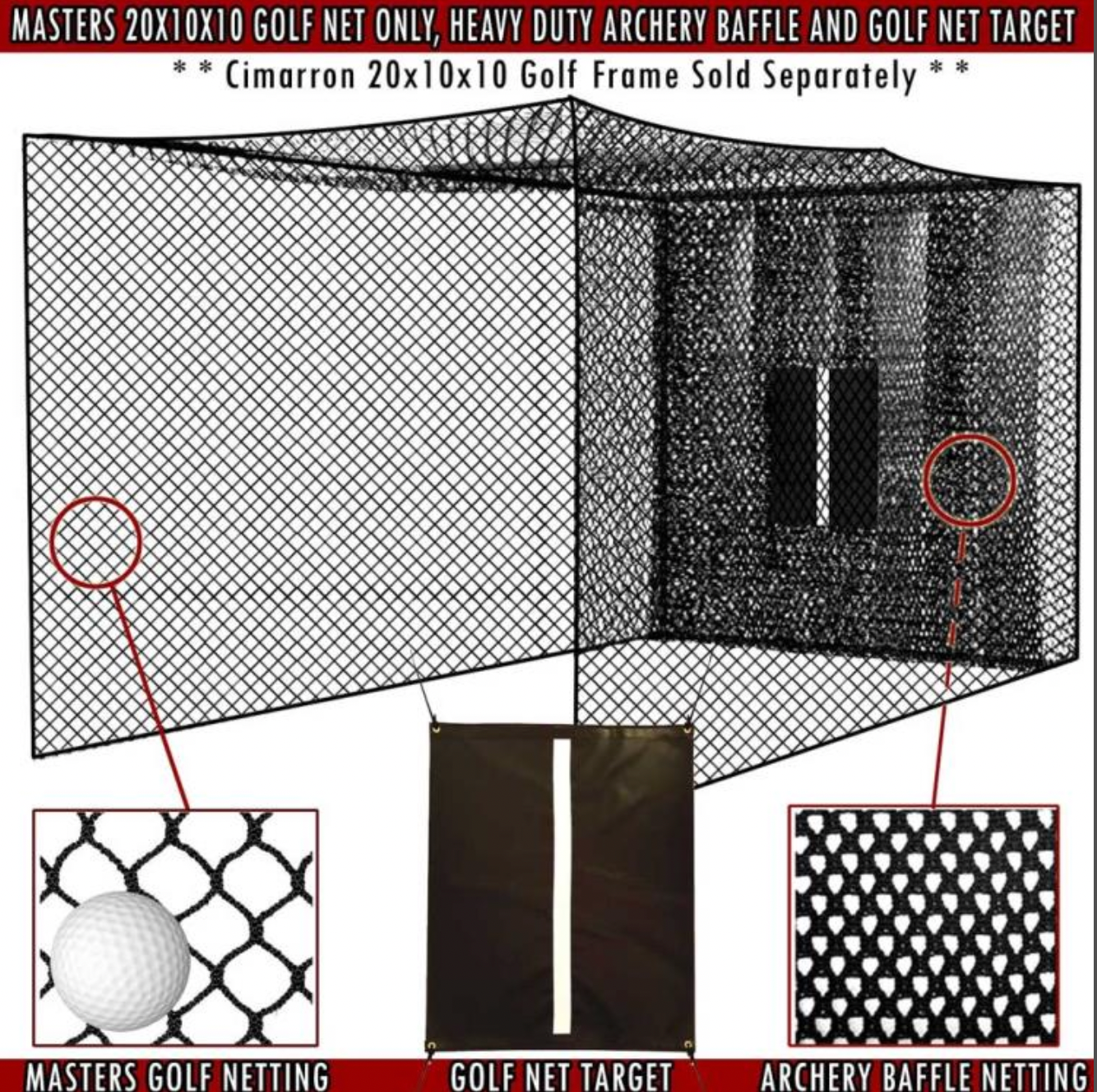 Cimarron 20x10x10 Masters Golf Net and Baffle is 20' deep and enclosed on three sides and at the top. The Masters Golf Net creates a secure playing environment and stops all stray balls that do not hit the baffle net.