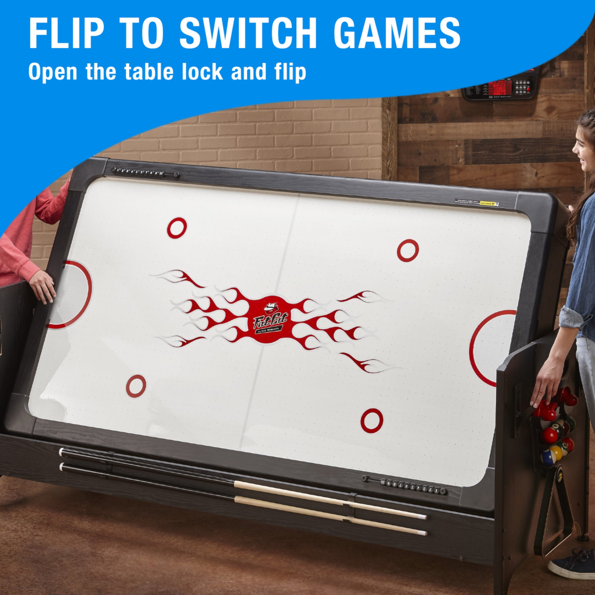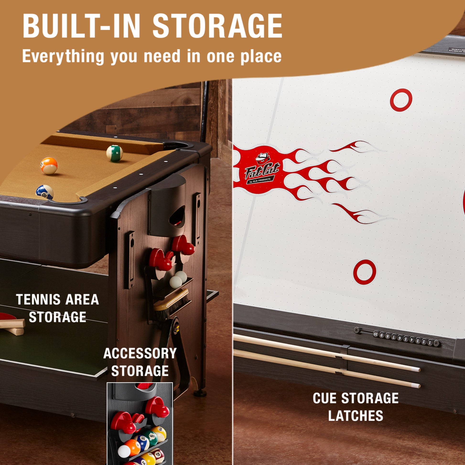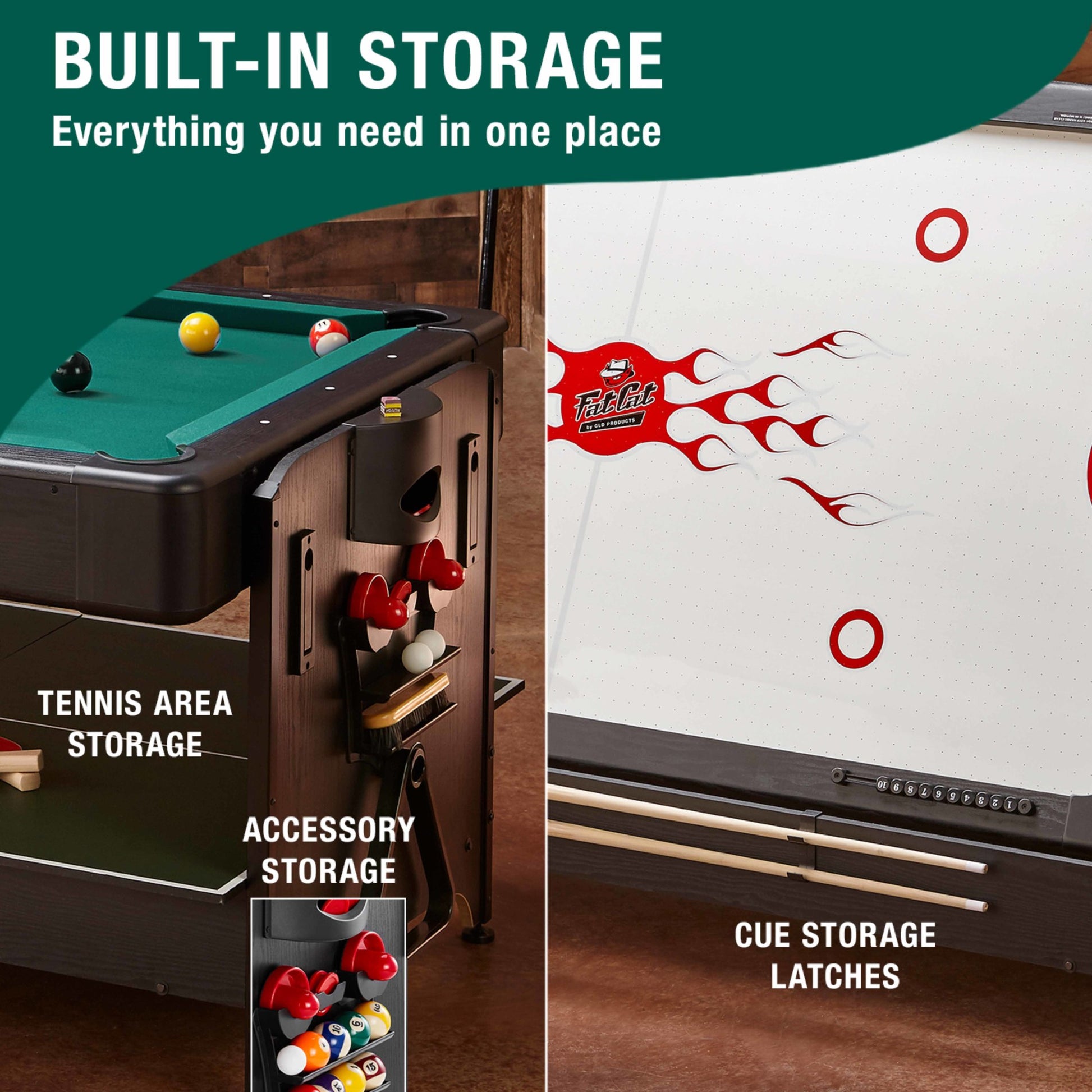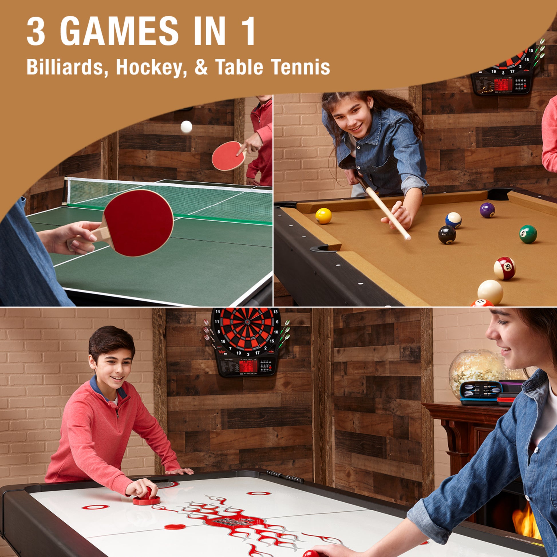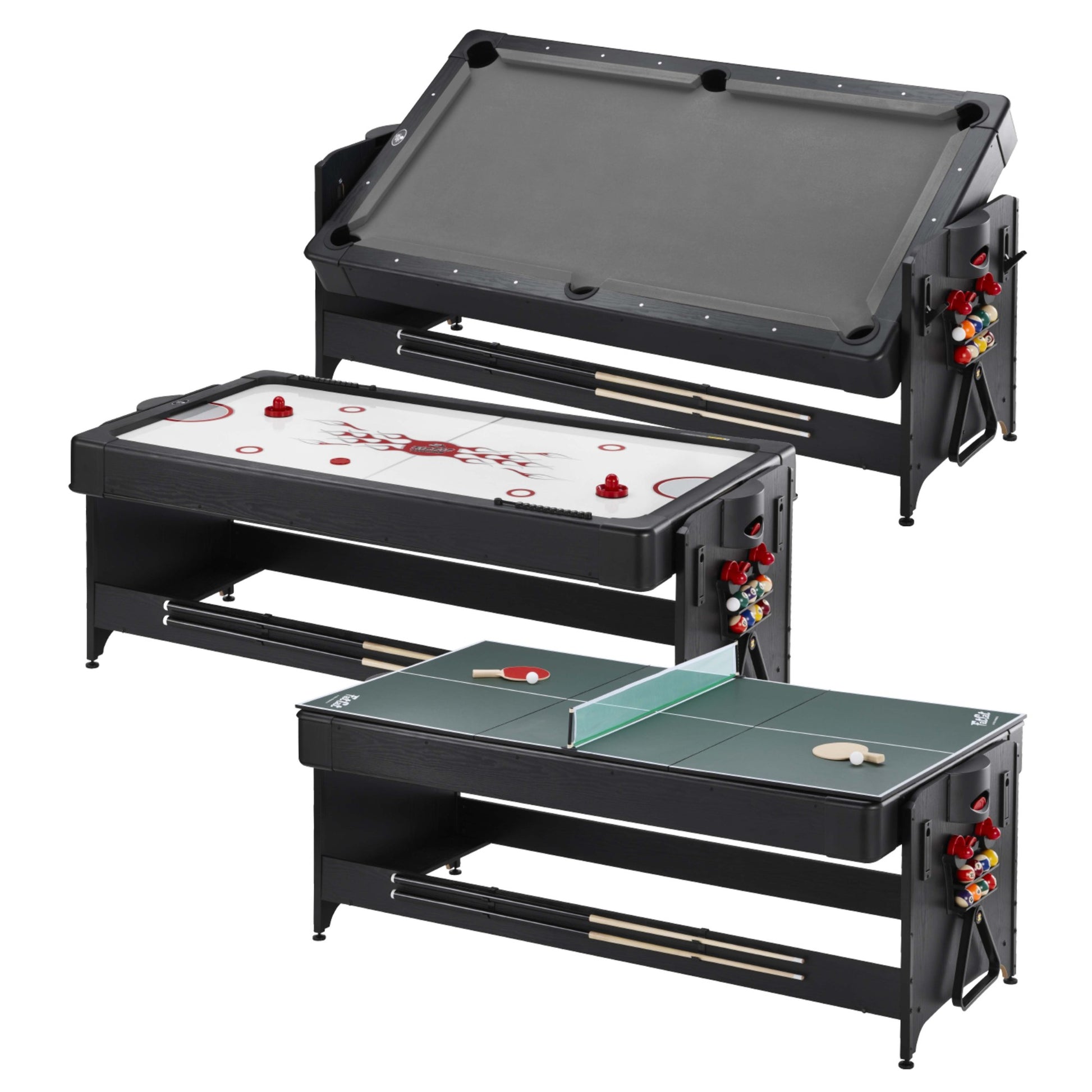 Includes all of the accessories needed to play the games you love such as pool cues and billiard balls, hockey pucks and pushers, and table tennis paddles and net.