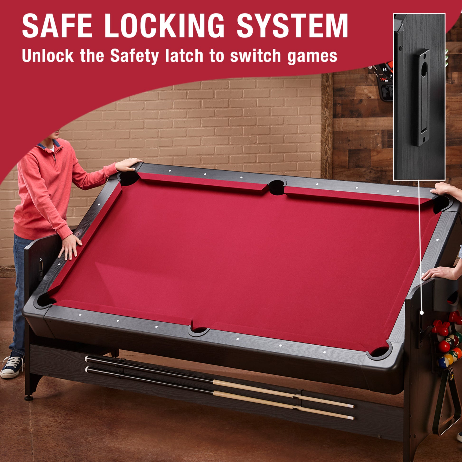Tri-fold tabletop technology makes changing games a snap, just unlock the latches and flip it over! Can also be locked upright for simple storage.