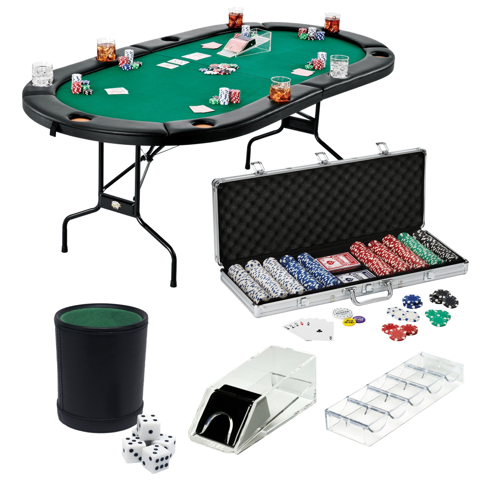 GLD Fat Cat Texas Hold'em Table, 4-Deck Card Shoe, 500 Poker Chip Set, 2 Acrylic Chip Trays & Dice Cup Set 55-0131
