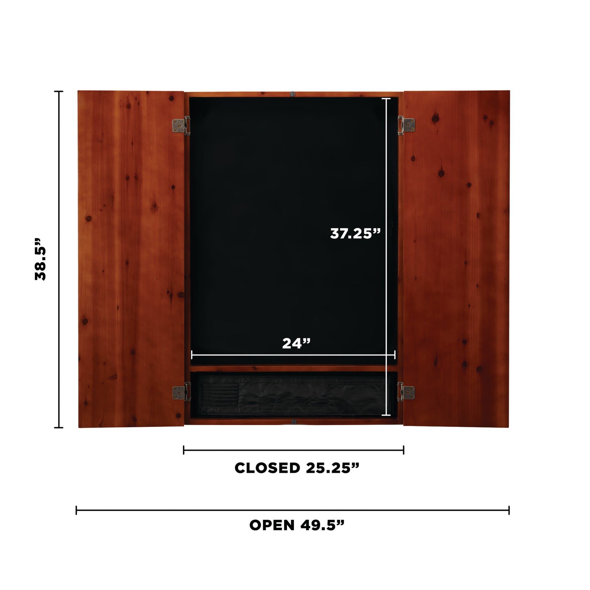 Begin your darting journey! This comprehensive bundle includes everything you need to make a stylish addition to your game room. Each set includes a premium dartboard cabinet, a 777 electronic dart board designed for Soft Tip darts. The dartboard cabinet is made from solid pine and constructed with finger joints and bronze hinges for a classic look that will match well with a traditional décor. The 777 features a regulation 15.5” target face gives a unique darting experience with its dual scoring display. With 26 games and over 115 scoring options, you and your crew will surely never run low on variety. The stylish color scheme utilizes sharp red, white and blue on a deep black to make your board stand out among competitors. The 777 features Target Tested Tough segments that will stand up to the toughest bombardment, in addition to an ultra-thin spider to minimize bounce-outs. Furthermore, the 777 electronic dartboard features concave segment holes that lock in your shots. The scoreboard can utilize a cricket quick key to get you playing immediately. The multiplayer feature supports up to 8 players, so no one is left behind. A high tech Throw Line Light ensures that you will be throwing from regulation distance, without the worry of adhesive and a cabinet mounted light brings a new brightness to your game. Completing the bundle set is a Shadowbuster Dartboard LED Light to provide crystal clear vision.