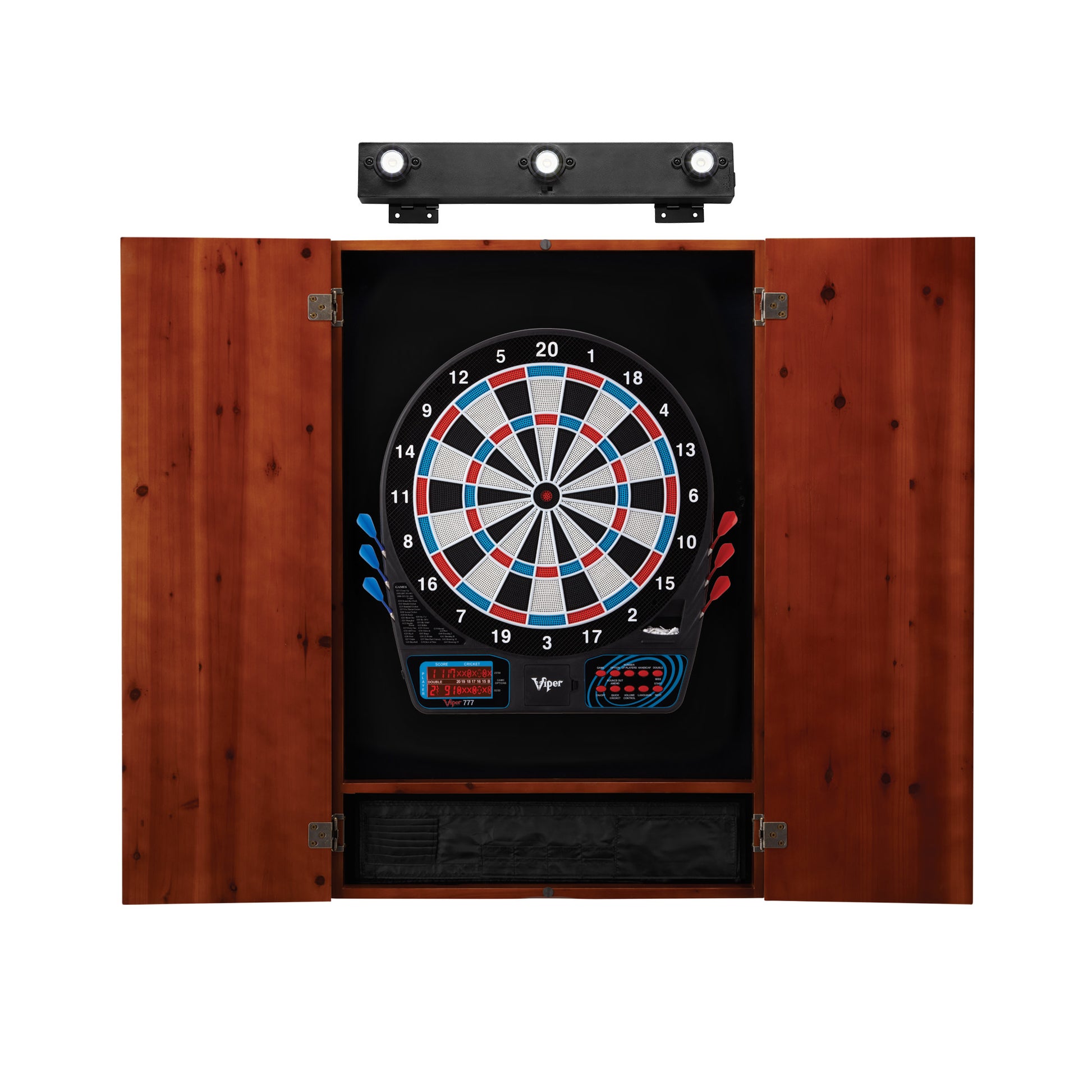 Includes Viper Metropolitan Cinnamon Soft Tip Dartboard cabinet, Shadow Buster Dartboard LED Light, and Viper 777 Electronic Dartboard that comes with six starter soft tip darts, 24 spare dart tips, AC adapter and storage slots built into the dartboard