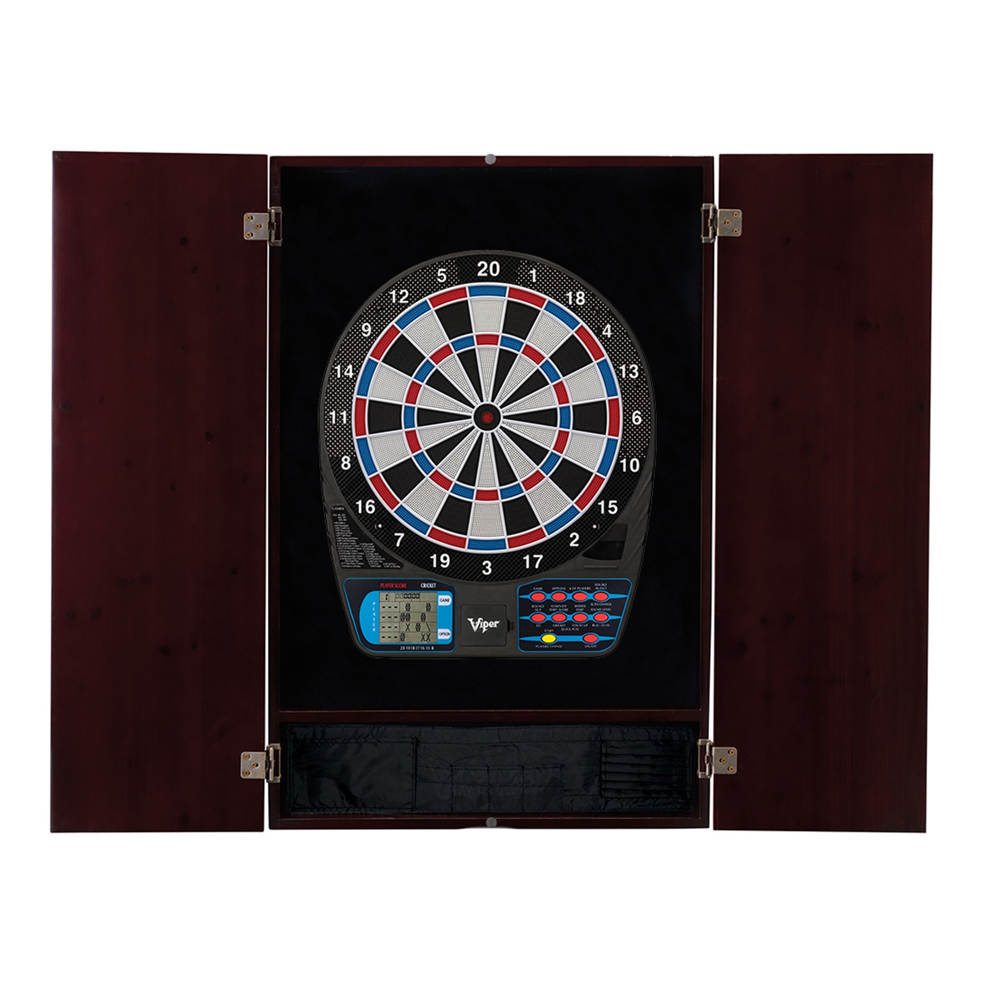 Includes Viper Metropolitan Mahogany Soft Tip Dartboard cabinet and a Viper 787 Electronic dartboard that comes with six starter soft tip darts, 24 spare dart tips, AC adapter and storage slots built into the dartboard