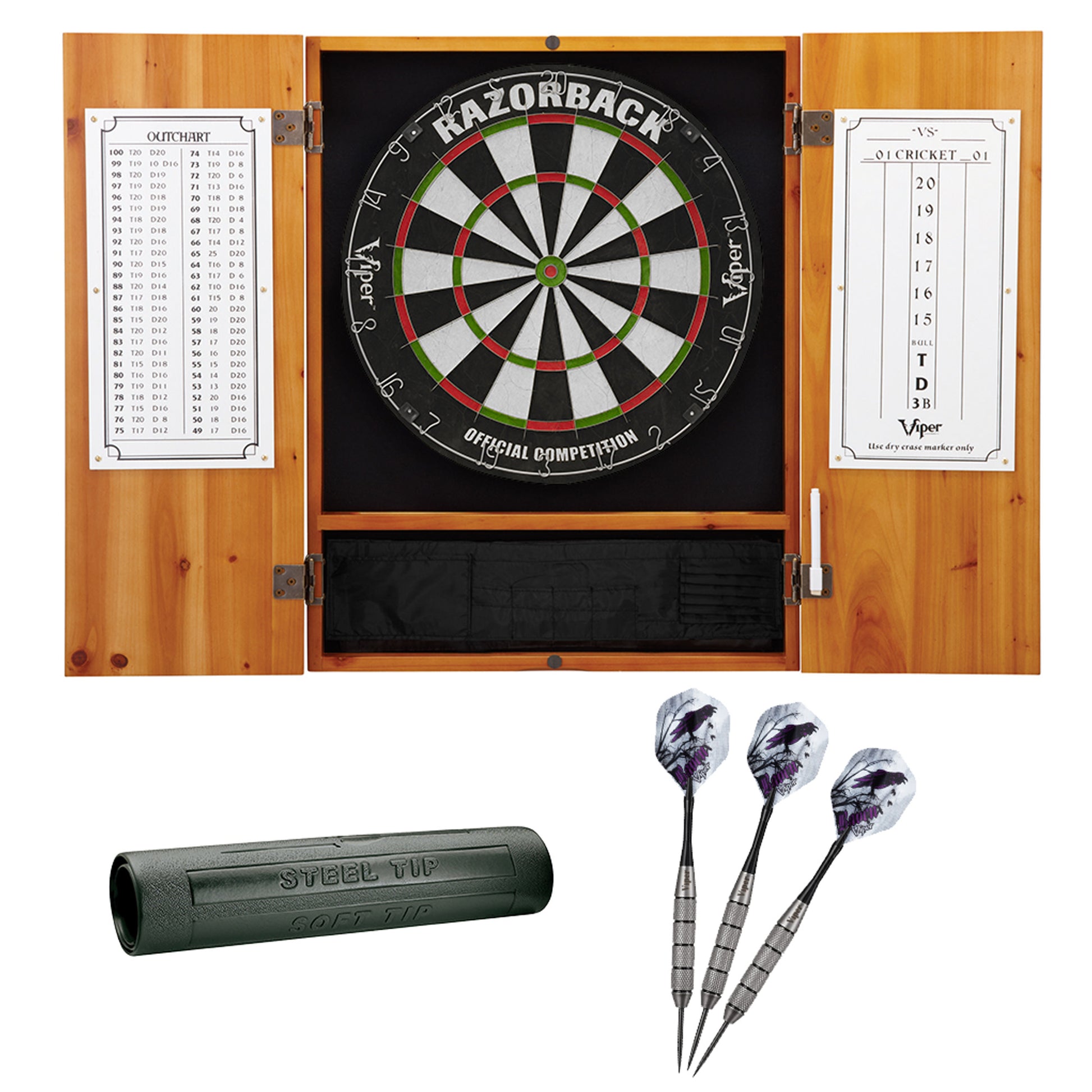 GLD Viper Metropolitan Steel Tip Dartboard Cabinet, Viper Razorback Sisal Dartboard, Viper Underground Raven Steel Tip Darts 25 Grams, and Viper Vinyl Dart Mat