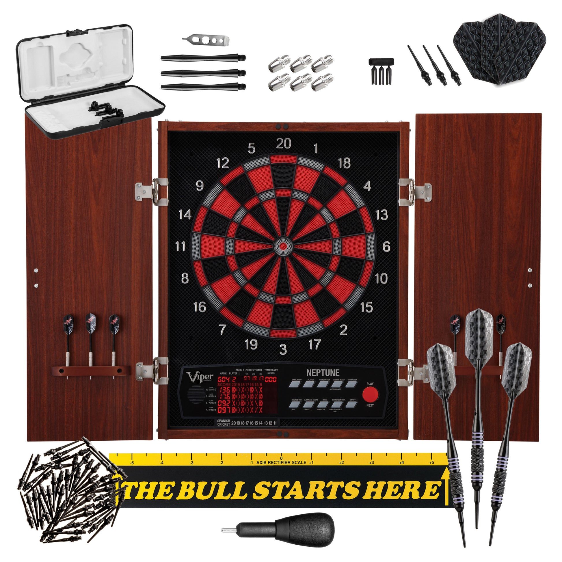 Includes Viper Neptune Electronic Dartboard and Cabinet Hybrid, Viper Bobcat Adjustable Weight Soft Tip Darts, Fat Cat Tip Remover, Viper “The Bull Starts Here” Throw Line Marker, and Viper Tufflex Tips II 2BA thread 1.25” long 50Ct Soft Tip Dart points