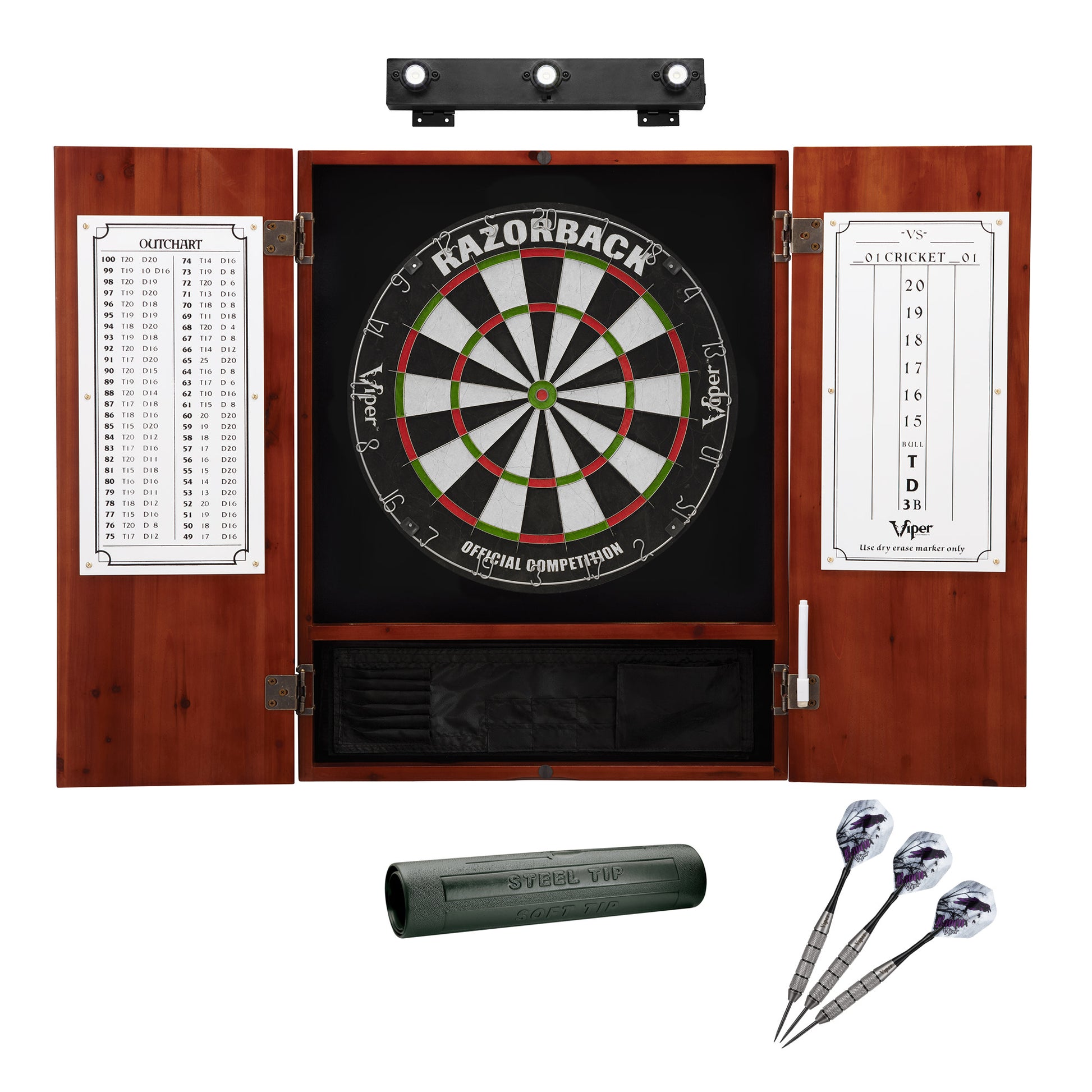 GLD Viper Razorback Sisal Dartboard, Metropolitan Cinnamon Cabinet, Shadow Buster Dartboard Lights, Padded Dart Mat & Underground Raven Steel Tip Darts 40-1159