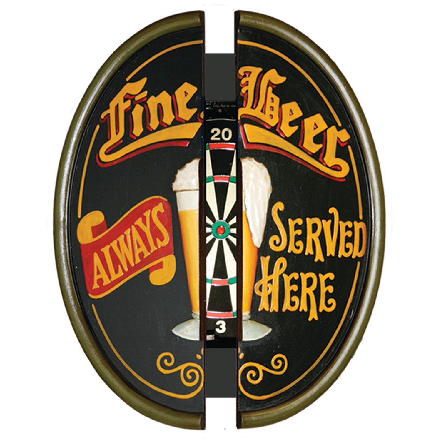 Amp up your devotion to a favorite hobby with this traditional solid wood fine beer dartboard cabinet. A fun addition to your game, this cabinet is crafted from solid wood and features a classic hand-painted finish and design. The cabinet opens to reveal and scoreboard and storage. Keep all your darts and accessories in one place with this charming cabinet.