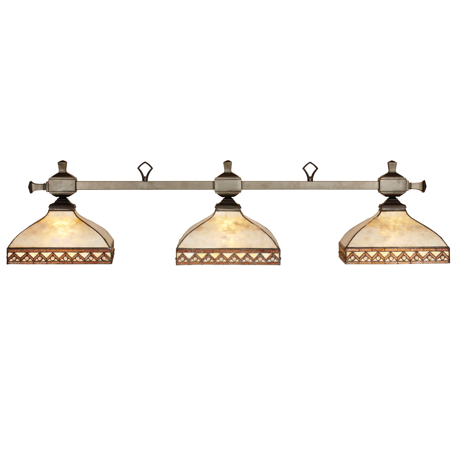 Soft beige mica finishing lends softness to the three glass shades with stained glass bordering featured on this metal billiards pendant light.