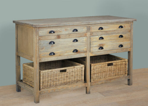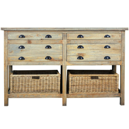 - Solid, reclaimed mahogany double-bay sideboard with four drawers and two baskets