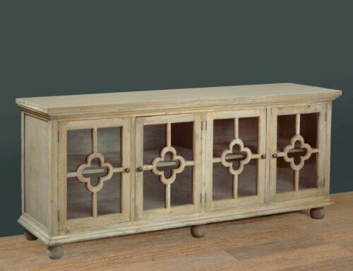 Hampton style with open display, this delightful distressed solid Mahogany wood glass door cabinet will brighten your day. Create an airy feeling of balance and serenity with the curved contemporary lines of this modern farmhouse cabinet. The glass doors are decorated with cloverleaf motifs that bring a sophisticated appeal while allowing a showcase for your dinnerware, colorful drink glasses, and heirloom collections. This transitional cupboard offers extra storage for a neat and tidy bedroom suite, ideal entryway credenza, dining buffet, living room TV stand or bathroom linen and toiletry organizer. Matching Shabby Chic Cottage Collection driftwood brown furniture is available to update your home in your own style.