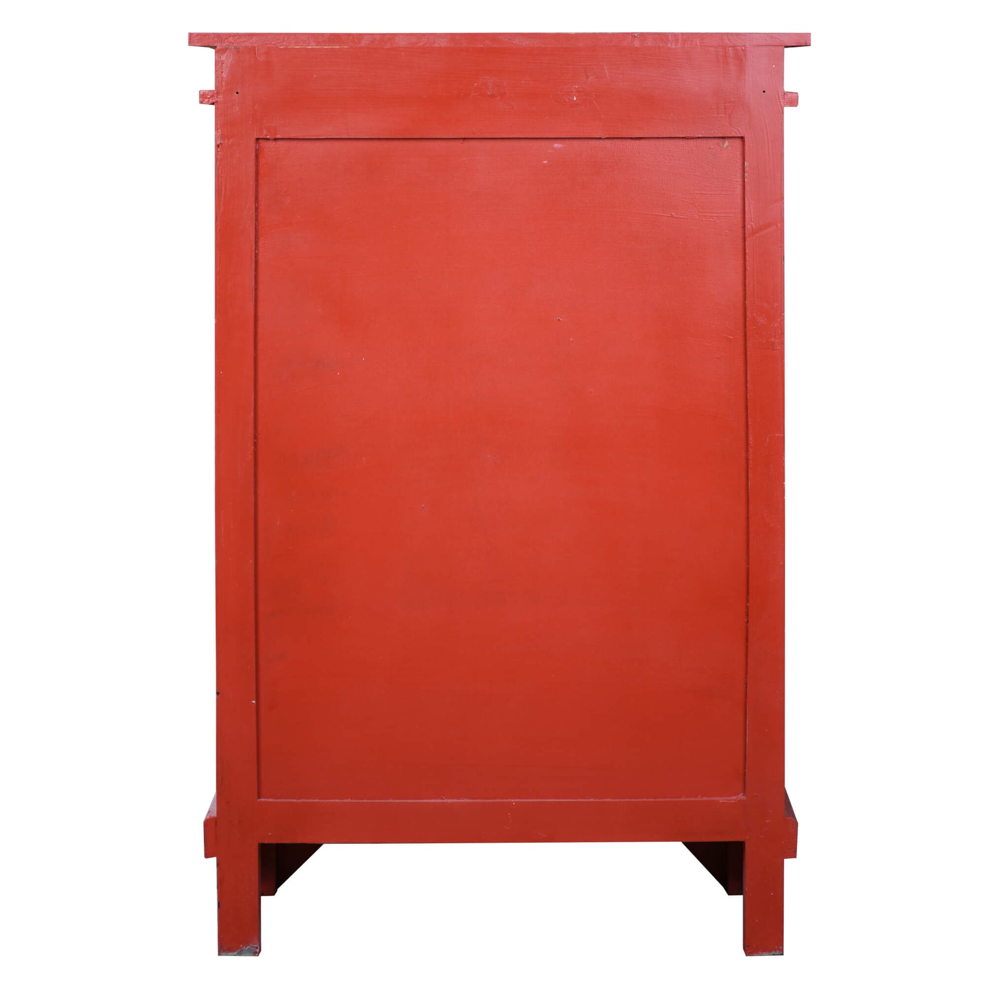 - Painted distressed red cabinet with carved wood doors