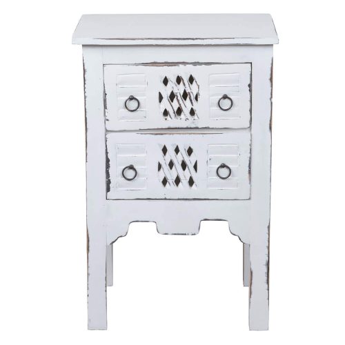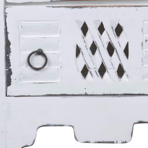 Add shabby chic charm with this whitewashed solid mahogany wood side table. Use as nightstand, living room side table or entryway accent. Open slats on sides provide Mission style with louvered and lattice front for a beachy vibe.