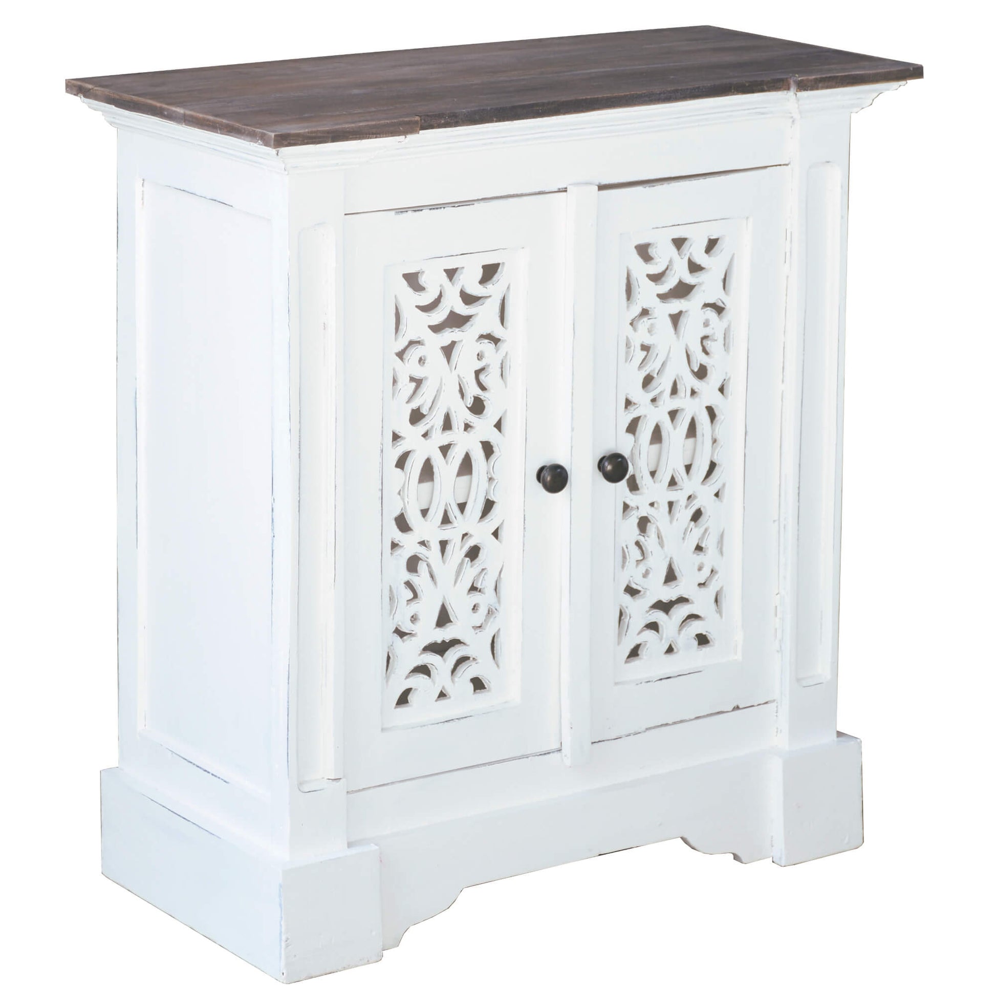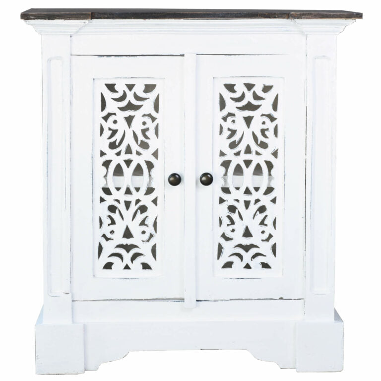 - Painted distressed white cabinet with carved wood doors and raftwood finish top