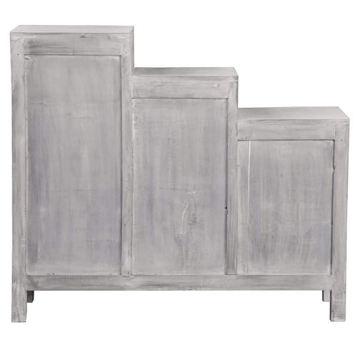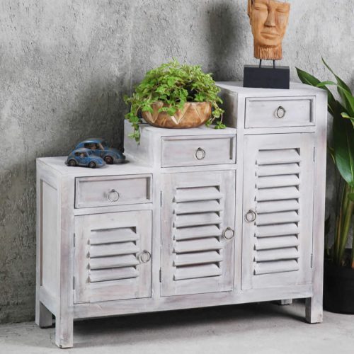 The stair step design of the Cottage three-tiered Tansu cabinet will command attention. The narrow design of this inviting shabby chic console is ideal for an entryway or hallway with plenty of hidden space to store. Whether you use it as a cupboard by day or a right-facing bedside table at night, allowing so much extra space for all the clothing, bags and electronics you have to store. Rustic distressing and shutter doors create a warm farmhouse look your friends will adore. This 3 tiered cabinet is sure to stretch the mind’s eye from the lower cabinet to the high.