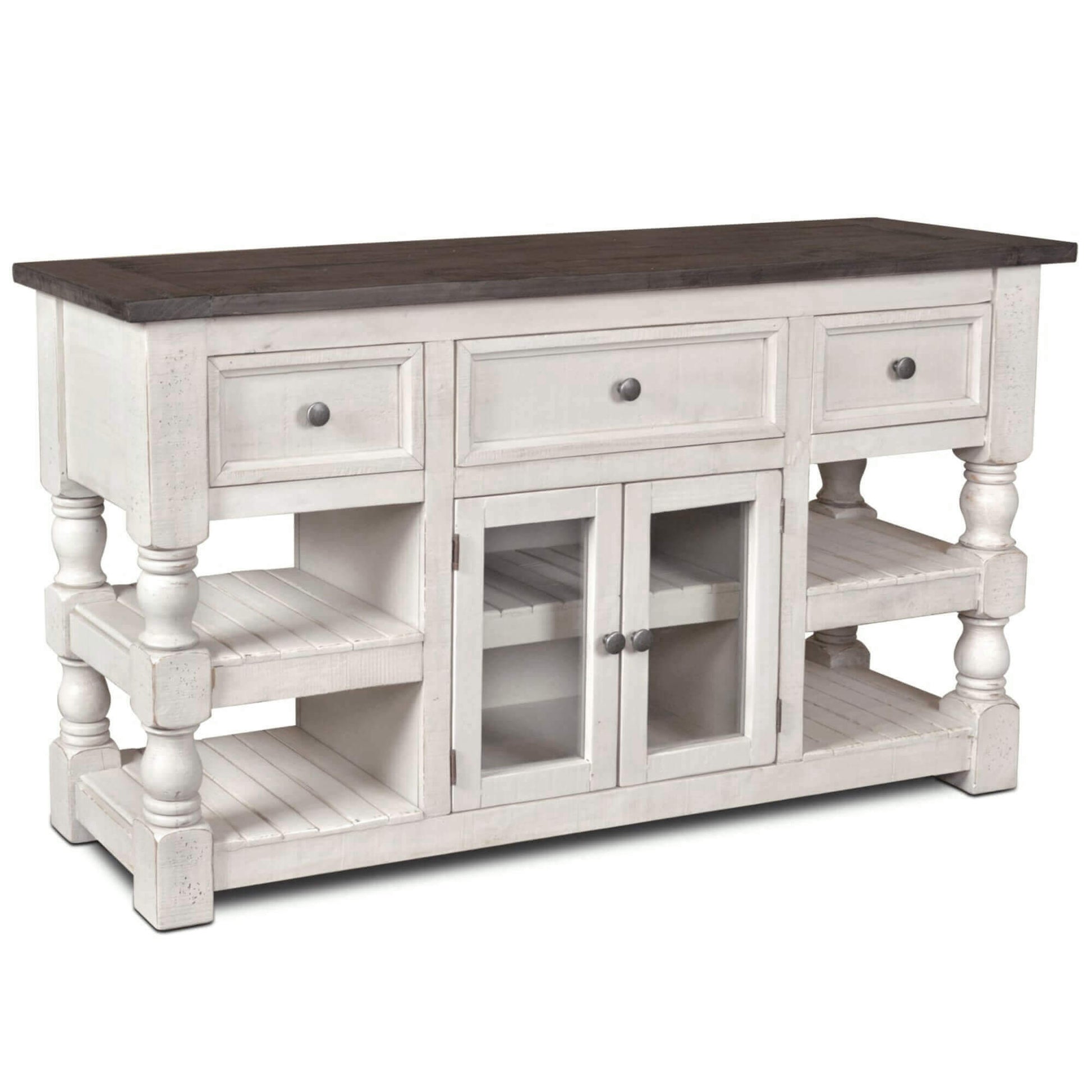 Farmhouse charm with a modern vibe, this beautiful three-tiered sofa table will add coastal living style to your lake house, country chic cottage or high rise. Romantic antique white finish brightens your living space while the brown plank top will blend with your traditional decor. Thick baluster columns add warmth and elegance. Open shelves, three drawers and glass front cabinets for storage of games, books, display decorative accents or party essentials. Ideal TV stand, kitchen sideboard, dining room server, bathroom or entryway storage furniture. Authentic wood planks and squared feet ground this living room occasional table with contemporary style. Like the surf hitting the sand, have one room flow into the other, create a curated look with matching coffee and side tables, sideboards, bedroom and dining furniture.