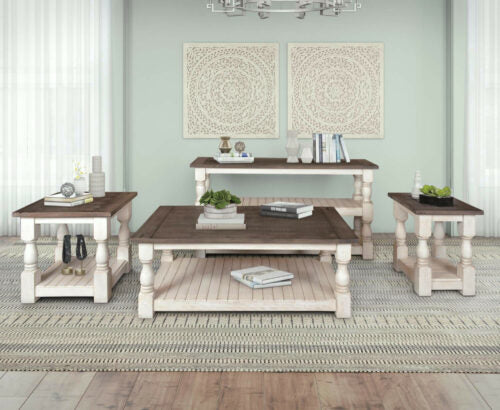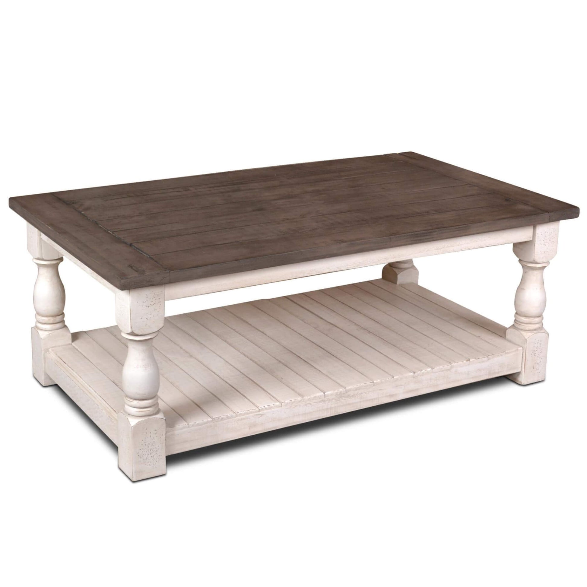 Farmhouse charm with a modern vibe, this beautiful coffee table will add coastal living style to your lake house, country chic cottage or high rise. Romantic antique white finish brightens your living space while the brown plank top will blend with your traditional decor. Thick baluster legs add warmth and elegance. Floor shelf for storage of games, books, display decorative accents or keep blankets handy on a cool cozy night. Ideal plant stand, laptop or phone table, small bathroom or entryway storage furniture. Authentic wood planks and squared feet ground this living room occasional table with contemporary style. Like the surf hitting the sand, have one room flow into the other, create a curated look with matching coffee and sofa table, sideboards, bedroom and dining furniture.