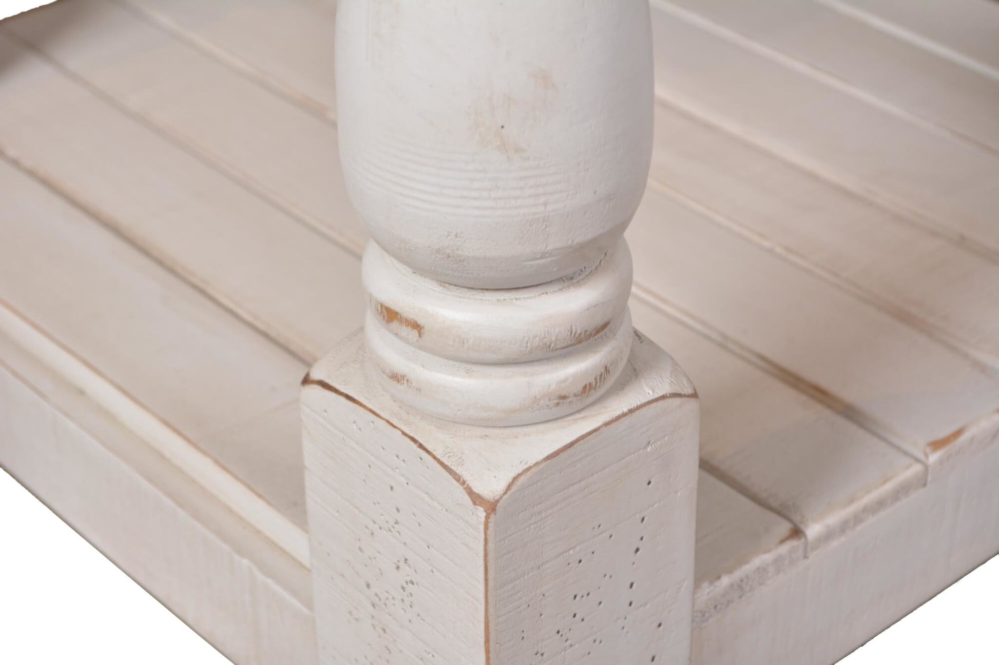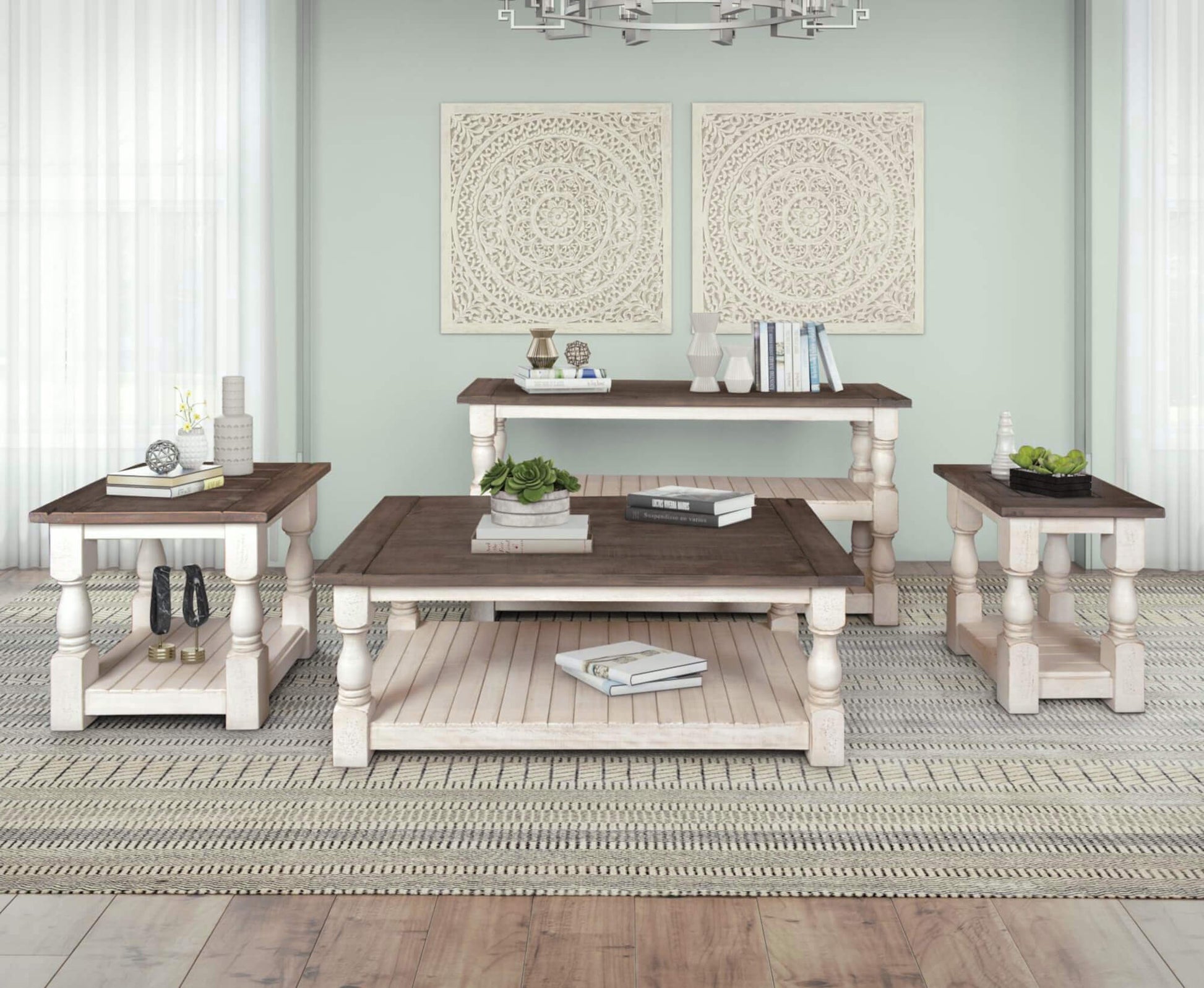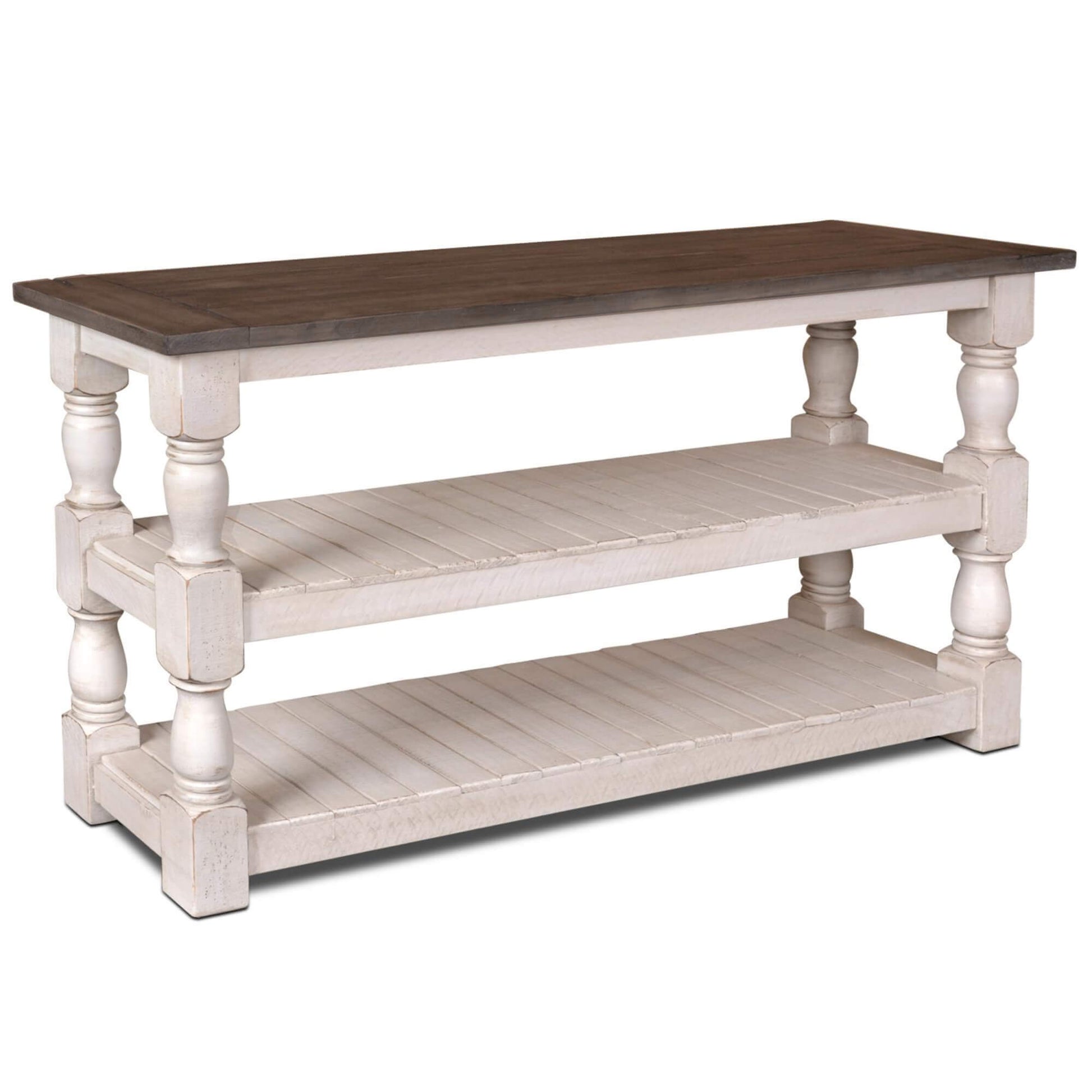 Farmhouse charm with a modern vibe, this beautiful sofa table will add coastal living style to your lake house, country chic cottage or high rise. Romantic antique white finish brightens your living space while the brown plank top will blend with your traditional decor. Thick baluster legs add warmth and elegance. Floor shelf for storage of games, books, display decorative accents or keep blankets handy on a cool cozy night. Ideal plant stand, laptop or phone table, small bathroom or entryway storage furniture. Authentic wood planks and squared feet ground this living room occasional table with contemporary style. Like the surf hitting the sand, have one room flow into the other, create a curated look with matching coffee and sofa table, sideboards, bedroom and dining furniture.